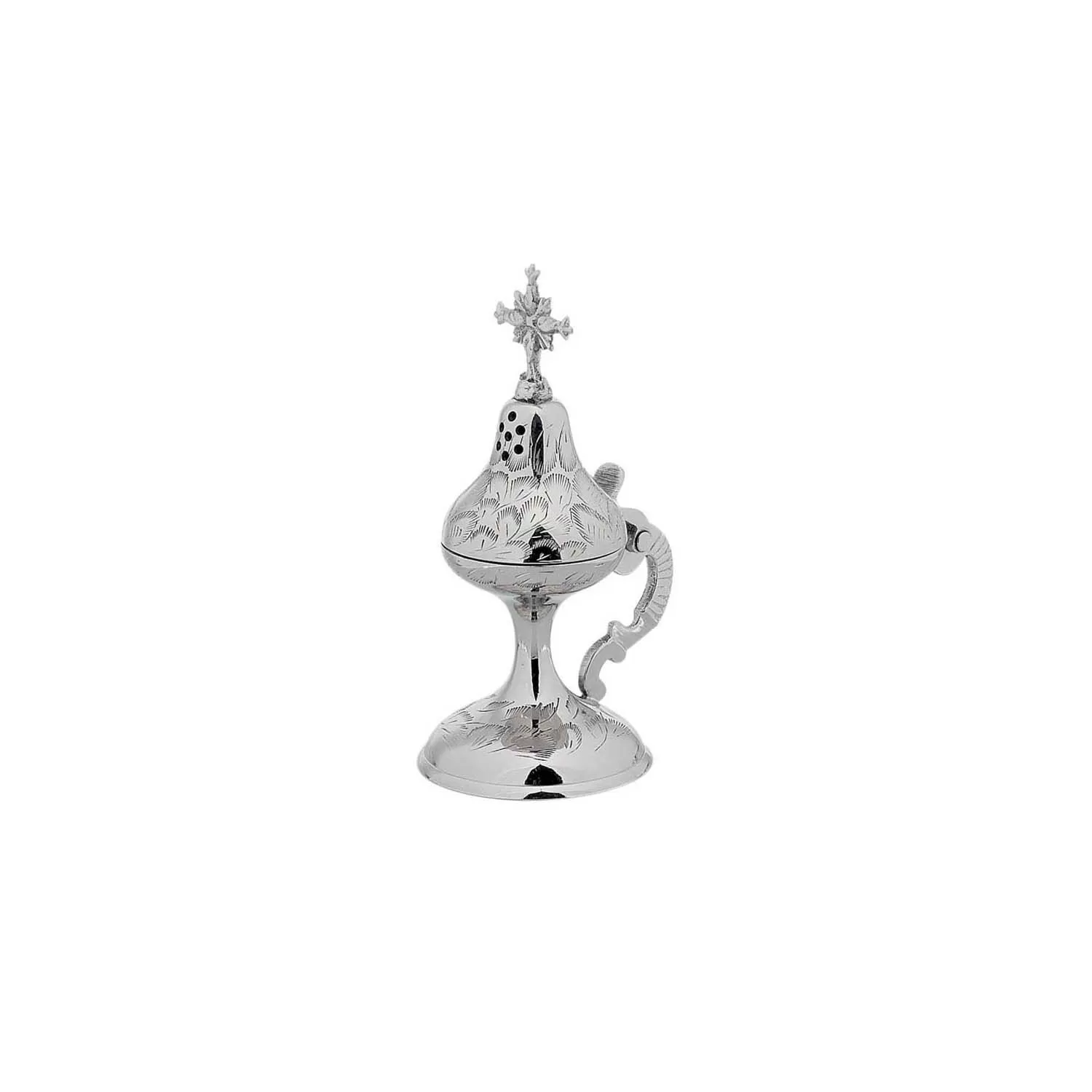 Carved nickel-plated home censer with cross on top. The orthodox home censer provides a unique atmosphere, filling our space with peace and spirituality. It is used in sacred temples, in our homes, and at the graves of our loved ones, creating a sense of reverence. When lit, the smoke that rises symbolizes our prayers, lifting our hopes and wishes toward God. Each time we use the censer, its fragrances fill the space with devotion, enhancing our connection with the Divine and enriching our spiritual life.