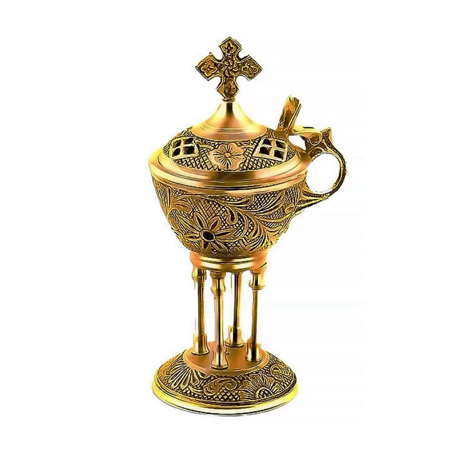 This brass censer is an engraved item designed for household use. Its surface has a bright golden hue, typical of brass, which highlights every detail of its design. The main body of the censer is adorned with intricate handmade carvings and features small perforations around it for the release of aroma. It stands steadily on a round, also engraved base. The domed lid completes the ensemble, featuring similar openwork designs for ventilation and topped with an ornate cross.