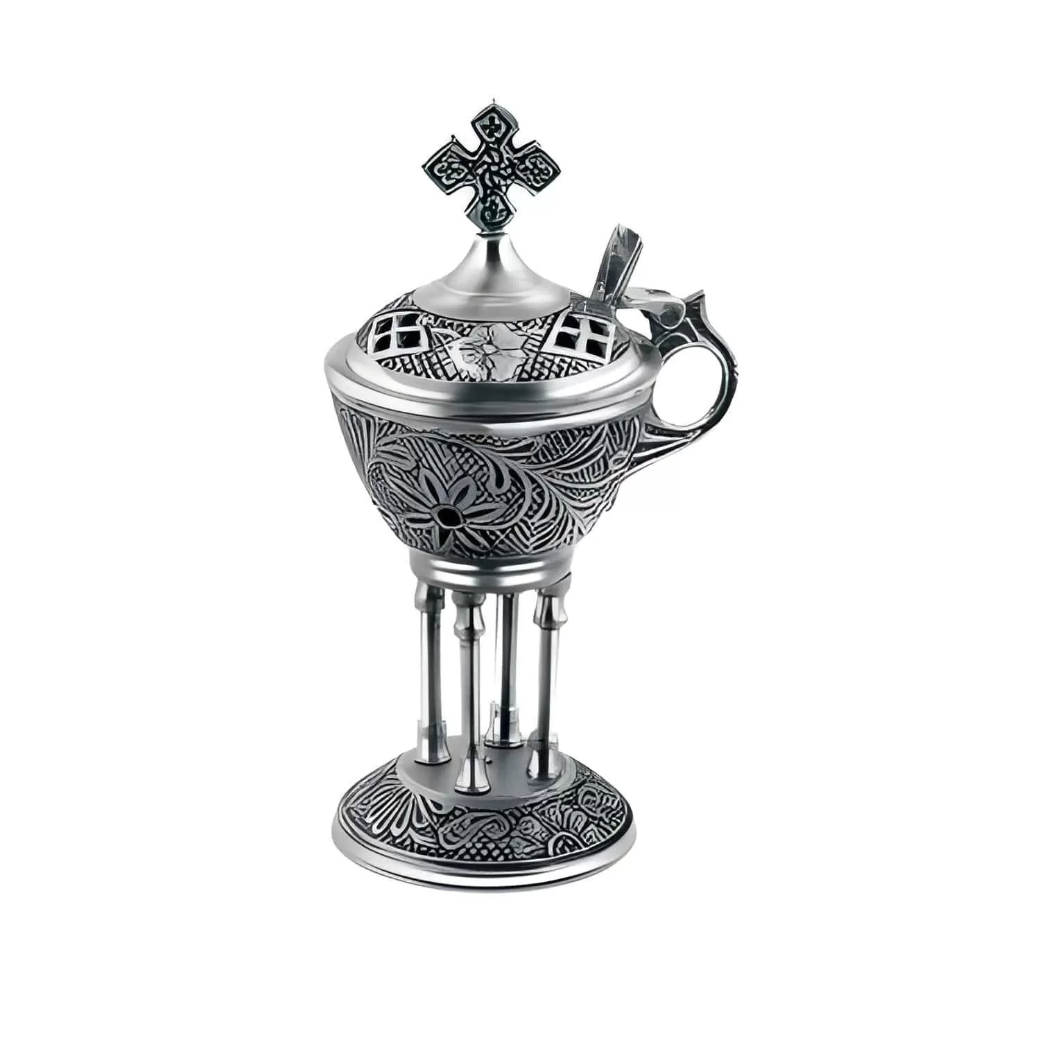 This nickel-plated censer is a carved object designed for home use. Its surface has a bright silver color, typical of nickel, which highlights every detail of its design. The main body of the censer is adorned with intricate handmade carvings and features small holes around the perimeter for the release of the fragrance. It rests securely on a round, also carved base. The domed lid completes the piece, bearing similar open designs for ventilation and an elaborate cross on its top.