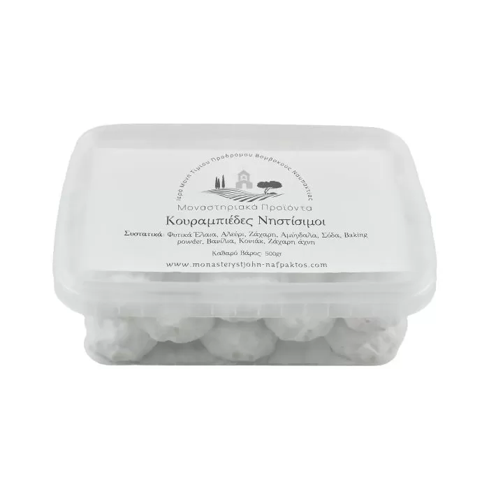 Vegan sweet (Kourampiedes) made with pure materials from the Holy Monastery of St. John the Baptist Vomvokous. Free of animal products, they are ideal for periods of fasting and are an ideal treat for any occasion.Ingredients: Vegetable oils, Flour, Sugar, Almond, Soda, Baking powder, Vanilla, Cognac, Icing sugar.Weight: 500 gr. / 1.10 lb.