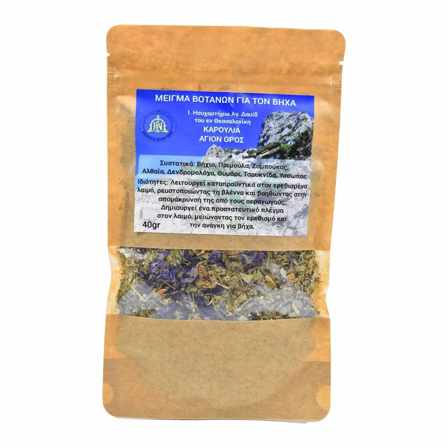 This natural herbal mixture for cough originates from Mount Athos, crafted with monastic knowledge. It contains carefully selected herbs such as mullein, primrose, elderberry, marshmallow, hollyhock, thyme, nettle, and hyssop, all known for their soothing properties. It works to relieve an irritated throat, liquefying mucus and reducing the need to cough. It creates a protective layer, offering an effective, natural solution. Available in a 40-gram package.