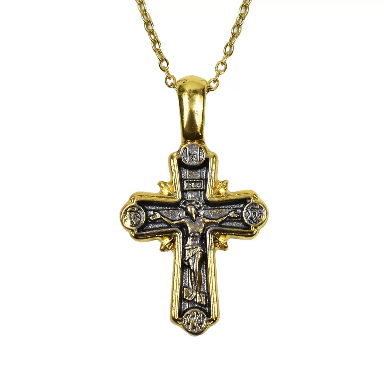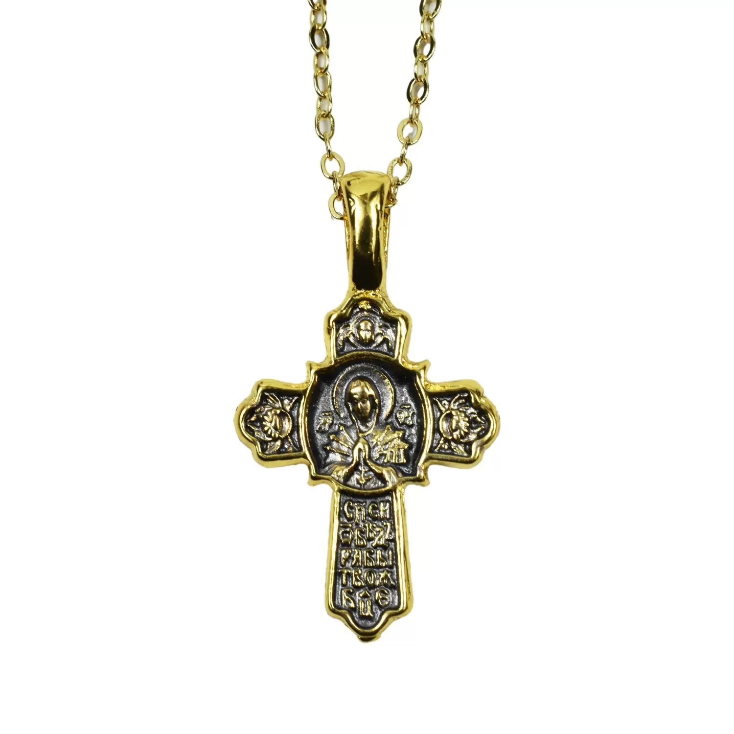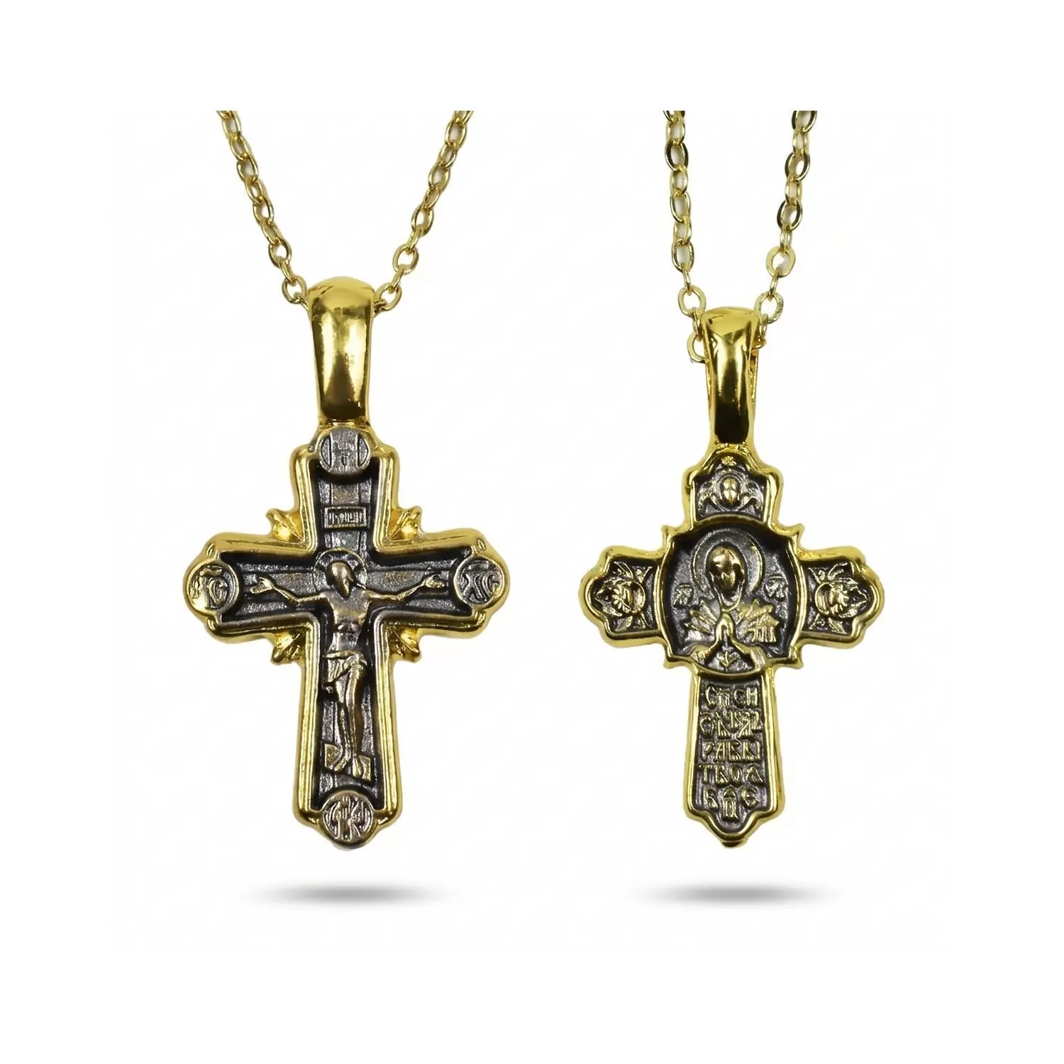 This authentic Orthodox monastic cross, crafted with reverence, serves as a sacred symbol of deep faith and spiritual protection. It is accompanied by an elegant stainless steel chain in a gold finish.