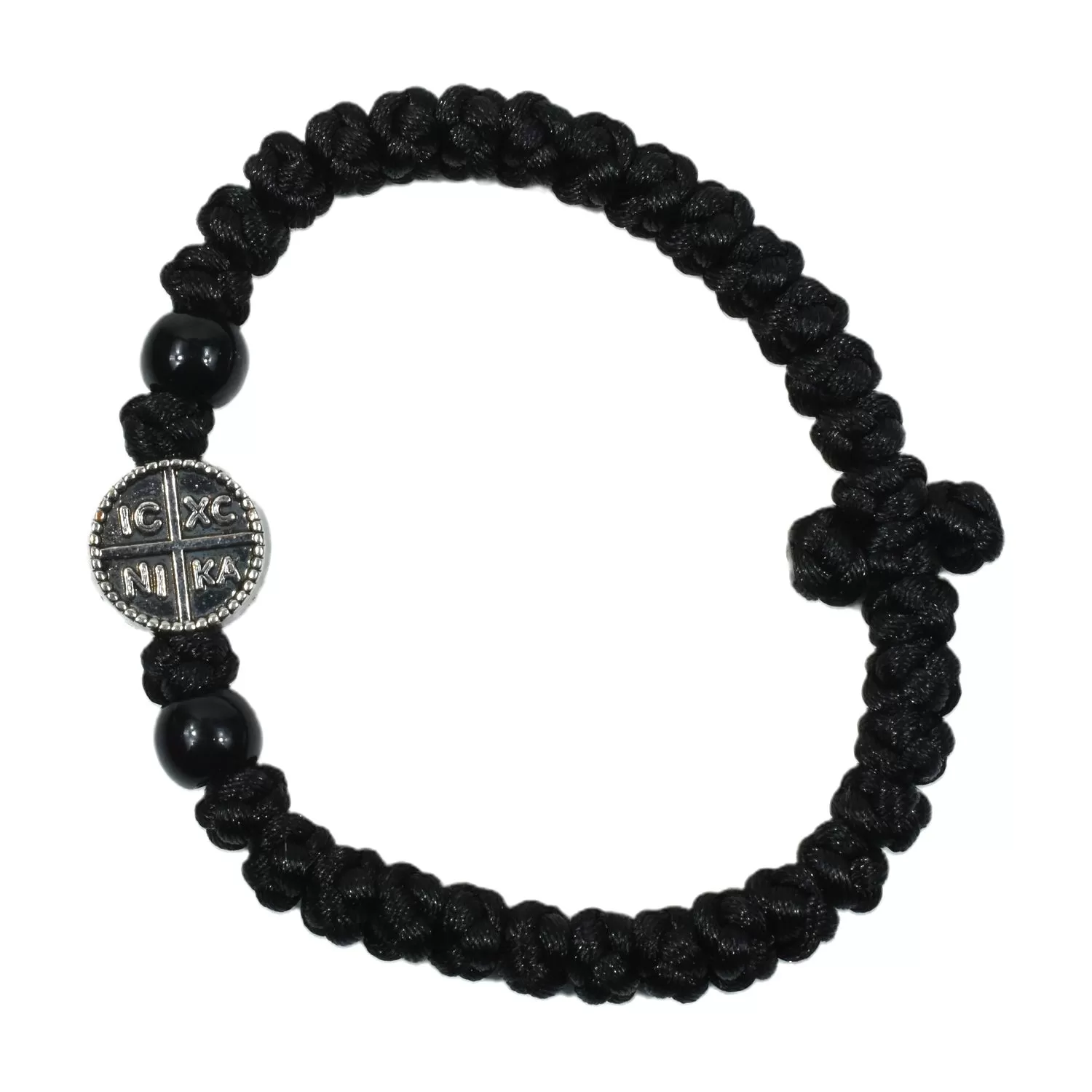 Traditional silk prayer rope bracelet (komboskini) made from black silk cord with traditional Orthodox knots. Features a circular medallion with IC XC NI KA inscription (Jesus Christ Conquers). Black beads on each side add to the all-black monochrome aesthetic. A discreet and reverent piece of jewelry, worn on the wrist, that reminds one of prayer and spiritual exercise.