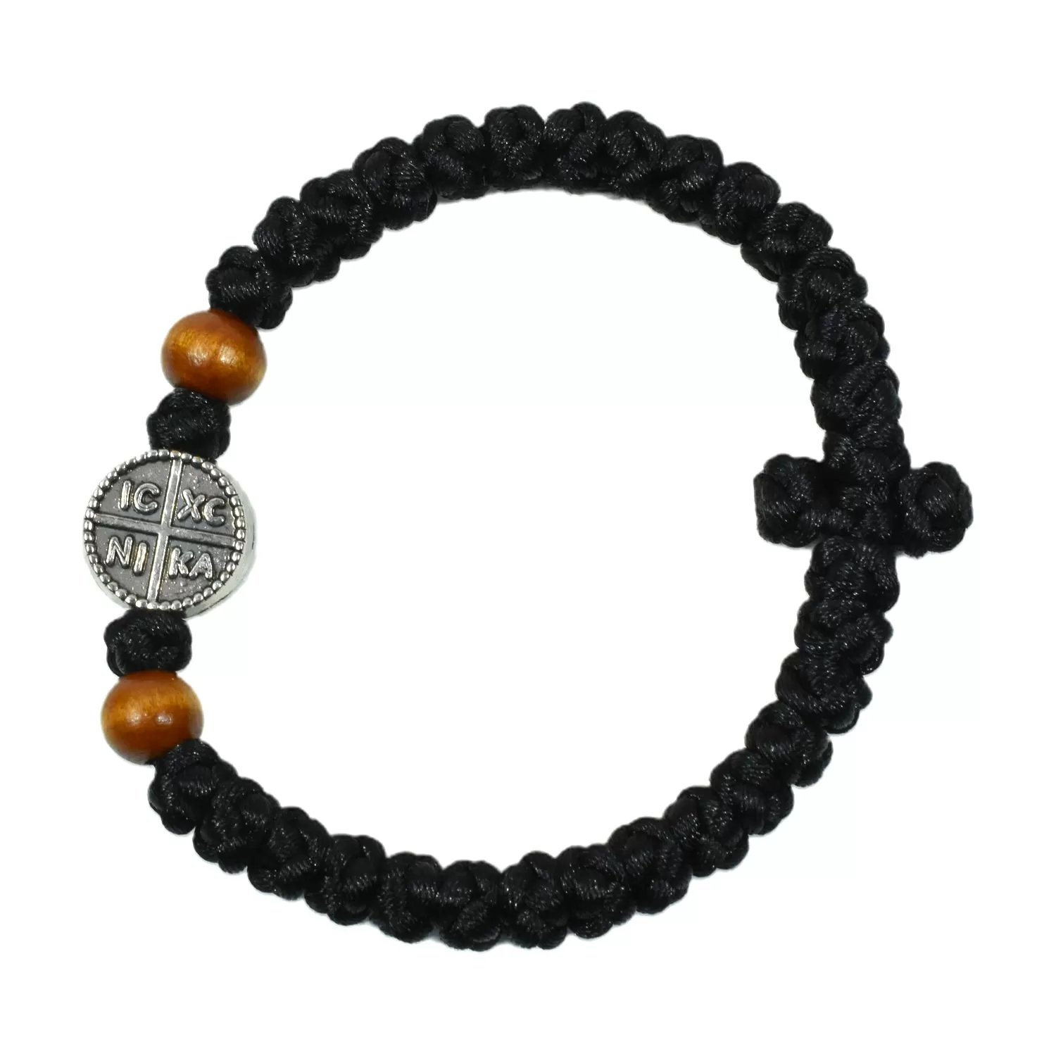 Mount Athos silk prayer rope bracelet (komboskini) meticulously crafted from black silk cord using traditional Orthodox knots. It features a circular medallion adorned with a cross and the inscription IC XC NI KA (Jesus Christ Conquers), a traditional Orthodox expression of victory. Two wooden beads are placed on either side of the medallion, adding a natural element. Wear this handmade prayer rope on your wrist as a symbol of faith and protection.