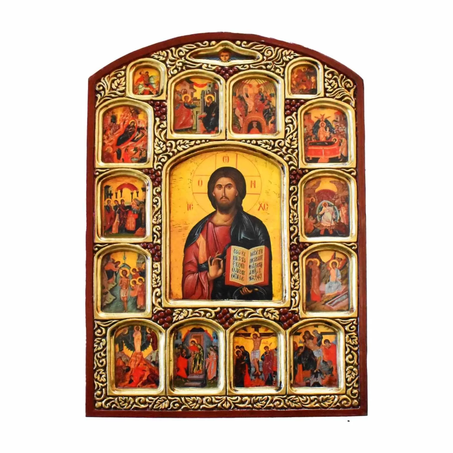 Multi-scene icon on natural wood, a handmade wooden icon reflecting the classic Byzantine tradition. At the center stands the main figure, while multiple smaller icons