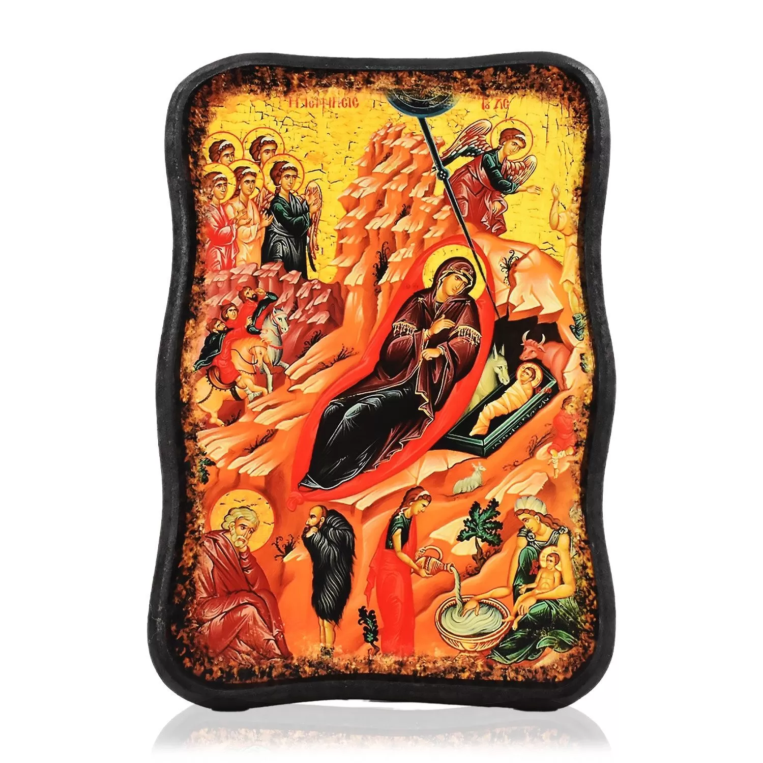 Irregular, handmade icon of the Nativity of Christ, crafted on natural wood. Each icon is created reverently by hand, rendering it absolutely unique. The natural irregularities of the wood and the detailed craftsmanship bestow special value, granting each piece its own distinct character. The traditional Byzantine depiction captures the scene in detail, imparting profound spiritual value.