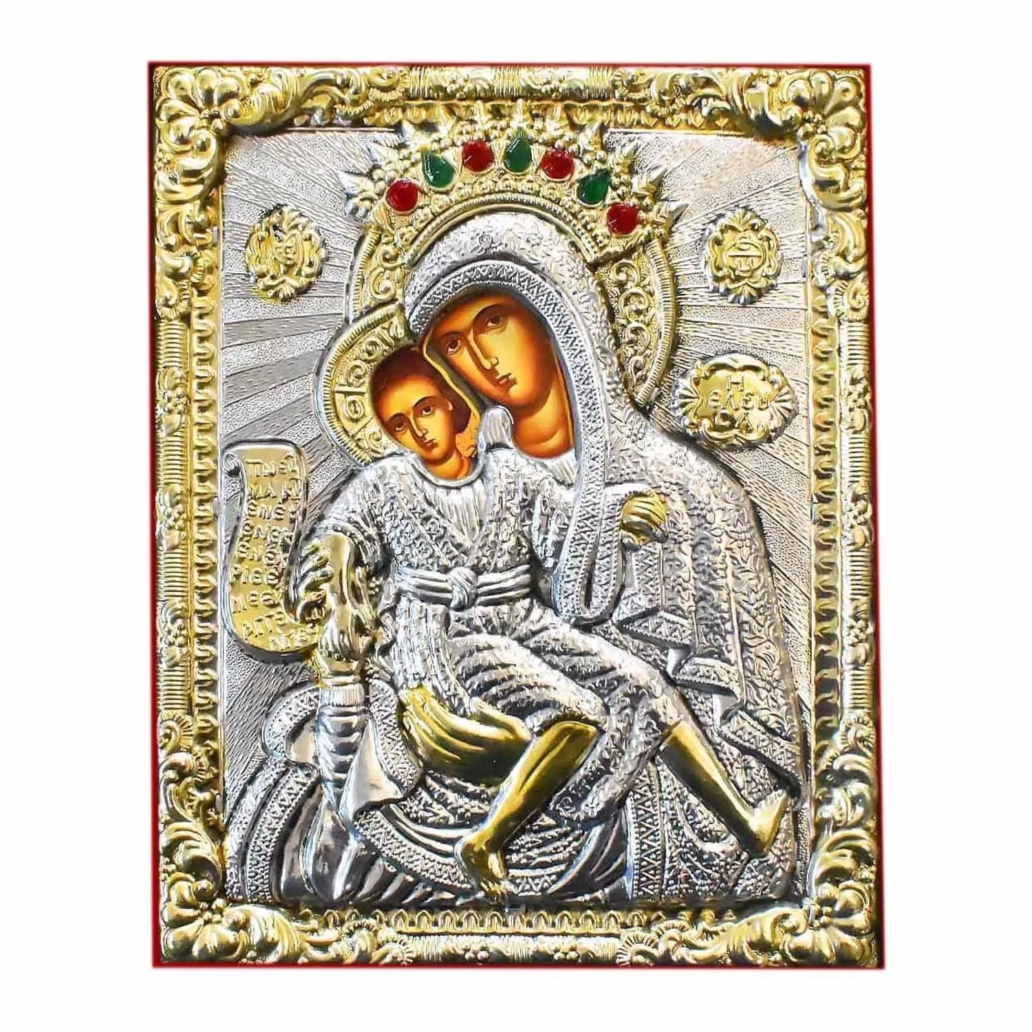 This is an exceptional, handcrafted silver-plated icon of high quality, mounted on a wooden base lined with luxurious red velvet. The combination of silver and velvet adds a unique sense of nobility and spirituality, making it ideal for any home or as a gift of great significance. The silver-plated surface has undergone a special treatment that guarantees it will never tarnish, maintaining its brilliance over time. A high-quality creation that blends ecclesiastical tradition with modern expertise, ensuring a result of superior aesthetics and durability.