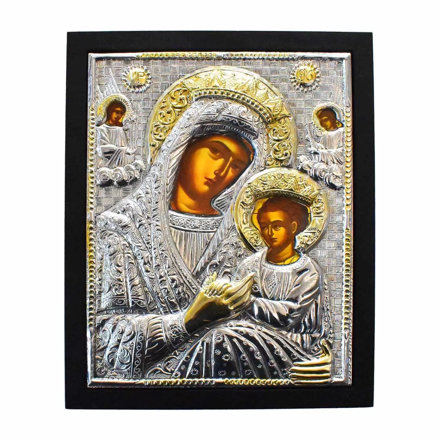 This is an exceptional, handmade icon, ideal for any home or as a gift of great spiritual significance. The icon is silver-plated and mounted on high-quality black wood. The silver-plated leaf is specially processed, which guarantees great durability over time and ensures that it will never tarnish, maintaining the metal's brilliance. Overall, this icon is a high-quality product that combines tradition with modern expertise in metal processing.