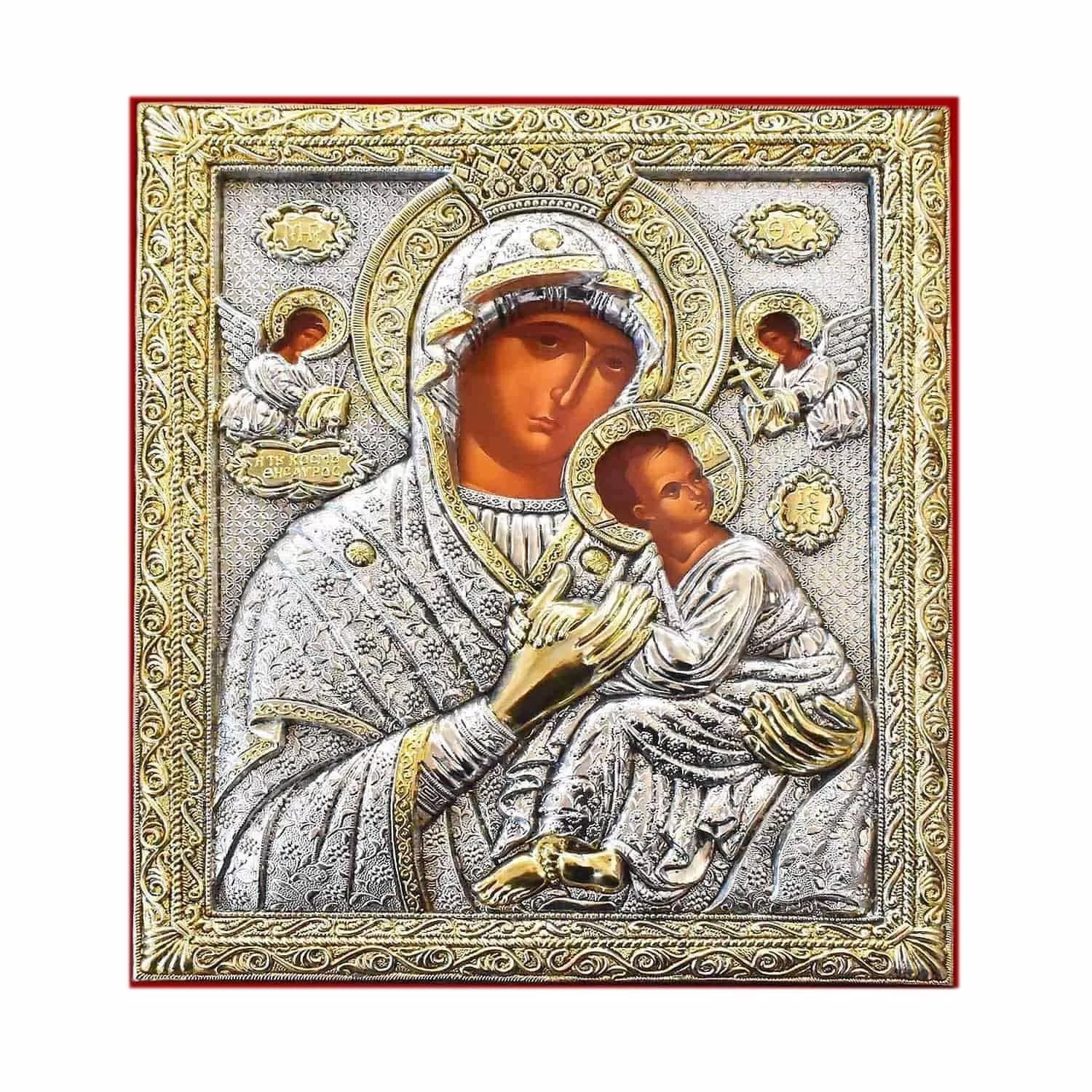 This is an exceptional, handcrafted silver-plated icon of high quality, mounted on a wooden base lined with luxurious red velvet. The combination of silver and velvet adds a unique sense of nobility and spirituality, making it ideal for any home or as a gift of great significance. The silver-plated surface has undergone a special treatment that guarantees it will never tarnish, maintaining its brilliance over time. A high-quality creation that blends ecclesiastical tradition with modern expertise, ensuring a result of superior aesthetics and durability.