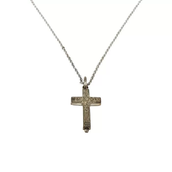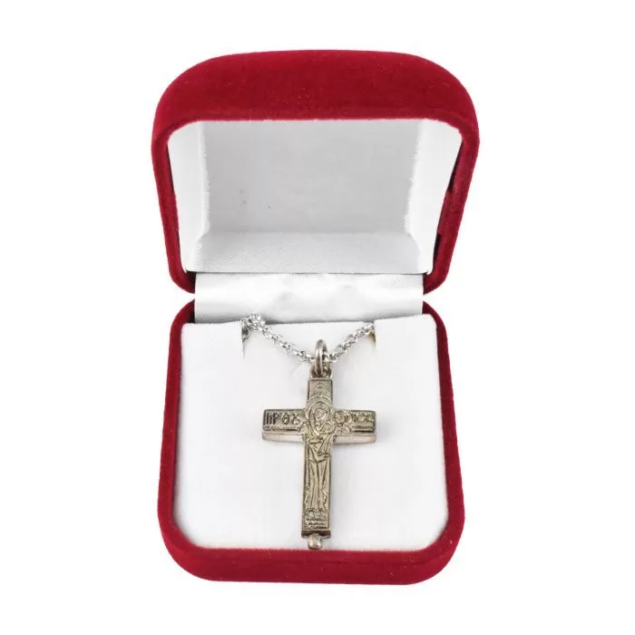 Unique opening neck cross made of pure 925 sterling silver from Mount Athos, decorated with engraved designs and the Virgin Mary holding our Christ. At the bottom it has a screw, which opens in a safe way for the placement and storage of holy relics. You can wear it daily as a symbol of your faith or give it to a loved one as a gift full of meaning and value. The cross is accompanied by a metal chain. Available in luxurious packaging.