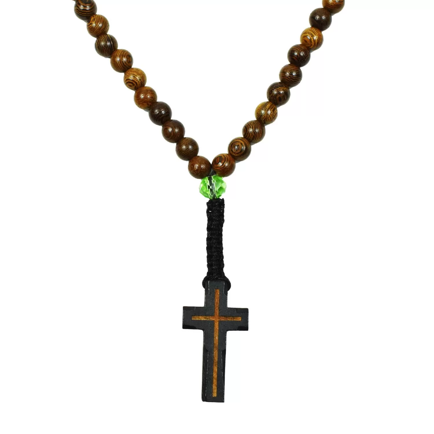 Prayer rope with 100 wooden brown beads and interspersed light green crystal decorative beads ending with an ornate wooden cross, culminating in an intricately crafted wooden cross connected with macrame braiding. This is an authentic prayer rope handmade with love and reverence here at Mount Athos. It combines traditional craftsmanship techniques with functionality for prayer and contemplation.