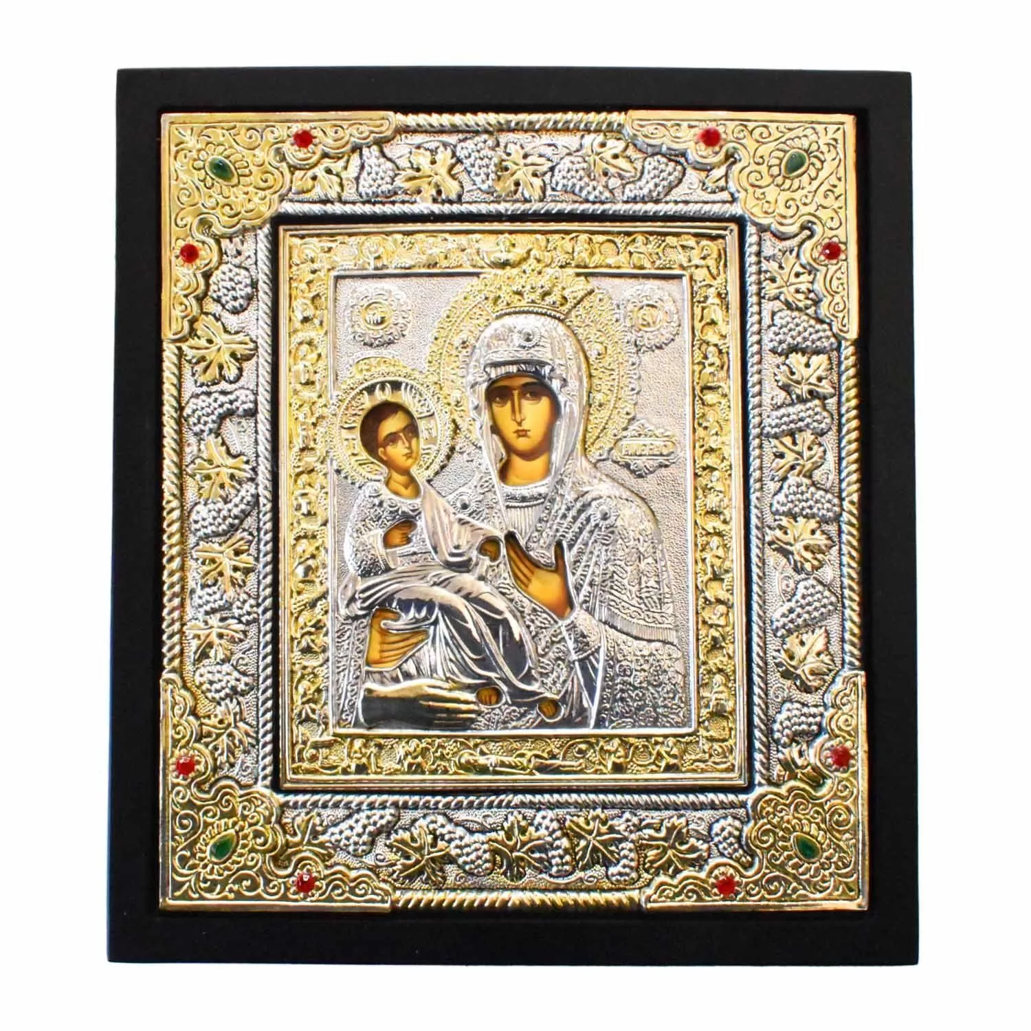 Πρόκειται για μια εξαιρετική, χειροποίητη εικόνα, η οποία διακρίνεται για τη μεγάλη αισθητική της αξία, ιδανική για κάθε σπίτι ή ως ένα δώρο μεγάλης πνευματικής σημασίας. Η εικόνα είναι επάργυρη και φέρει πλαίσιο σε μαύρο ξύλο υψηλής ποιότητας. Το επάργυρο φύλλο είναι ειδικής επεξεργασίας, το οποίο εγγυάται μεγάλη αντοχή στον χρόνο και εξασφαλίζει ότι δεν θα μαυρίσει ποτέ, διατηρώντας τη λαμπρότητα του μετάλλου. Επιπλέον, η εικόνα είναι διακριτικά στολισμένο με πέτρες τύπου Swarovski σε επιλεγμένα σημεία, προσδίδοντας μια πολυτελή λάμψη. Συνολικά, η εικόνα αυτή αποτελεί ένα προϊόν υψηλής ποιότητας κατασκευής, που συνδυάζει την παράδοση με τη σύγχρονη τεχνογνωσία στην επεξεργασία μετάλλου.