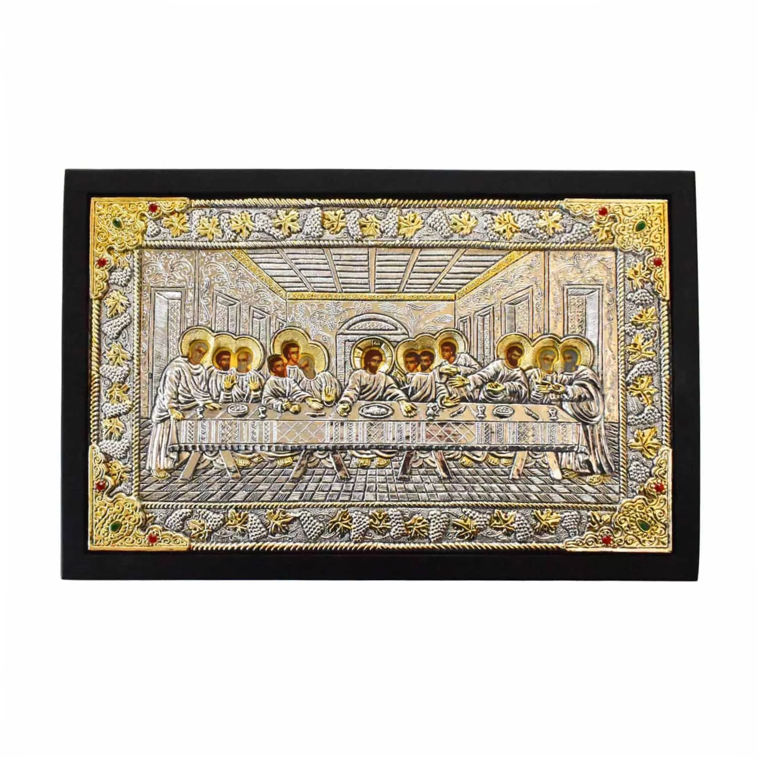 Εξαιρετική ορθόδοξη μεγάλη εικόνα του Μυστικού Δείπνου, επάργυρη σε ξύλινο πλαίσιο σε μαύρο χρώμα. Χρησιμοποιείται υψηλής ποιότητας τεχνική στην επαργύρωση για αντοχή στο χρόνο και στη φθορά. Ενώ συγχρόνως η λάμψη δημιουργεί εντυπωσιακή οπτική αντίθεση του μαύρου ξύλου και του μετάλλου που κάνει το θέμα της εικόνας να ξεχωρίζει. Μικρές πολύχρωμες χάντρες τύπου Swarovski κοσμούν το περίτεχνο πλαίσιο.