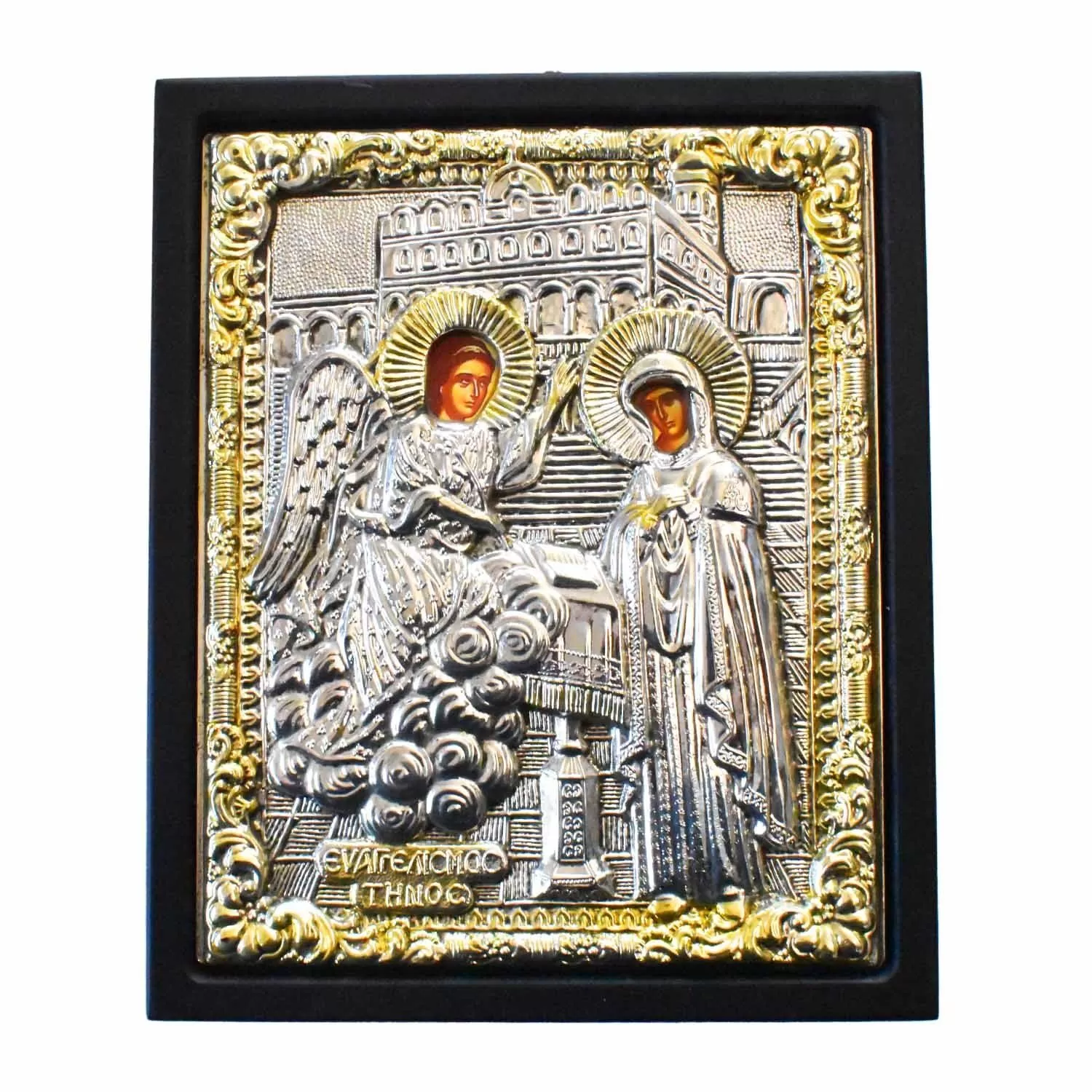 Πρόκειται για μια εξαιρετική, χειροποίητη εικόνα, η οποία διακρίνεται για τη μεγάλη αισθητική της αξία, ιδανική για κάθε σπίτι ή ως ένα δώρο μεγάλης πνευματικής σημασίας. Η εικόνα είναι επάργυρη και φέρει πλαίσιο σε μαύρο ξύλο υψηλής ποιότητας. Το επάργυρο φύλλο είναι ειδικής επεξεργασίας, το οποίο εγγυάται μεγάλη αντοχή στον χρόνο και εξασφαλίζει ότι δεν θα μαυρίσει ποτέ, διατηρώντας τη λαμπρότητα του μετάλλου. Συνολικά, η εικόνα αυτή αποτελεί ένα προϊόν υψηλής ποιότητας κατασκευής, που συνδυάζει την παράδοση με τη σύγχρονη τεχνογνωσία στην επεξεργασία μετάλλου.