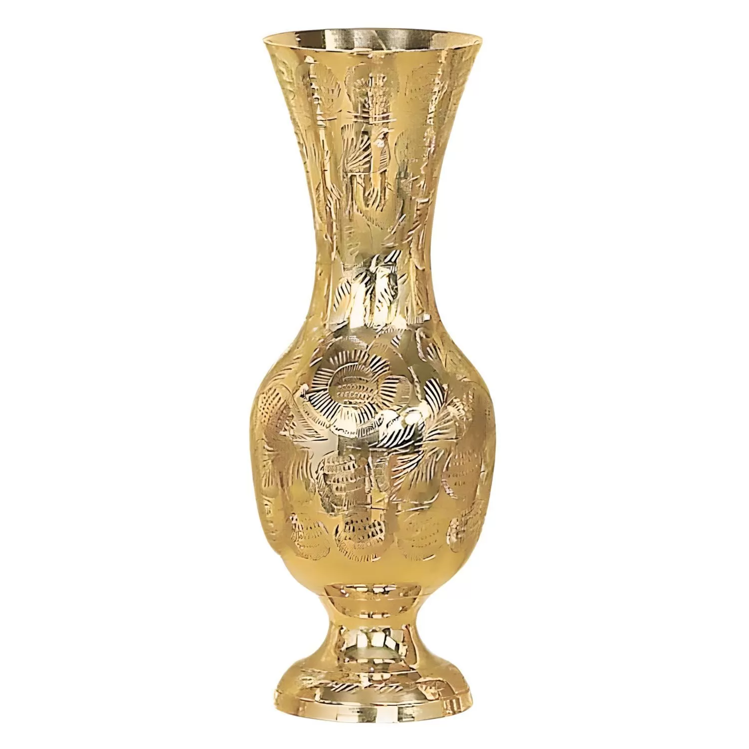 Αυτό το ανθοδοχείο είναι κατασκευασμένο από μπρούτζο και έχει ένα λαμπερό, χρυσαφί χρώμα. Το αντικείμενο φέρει πλούσιο σκάλισμα που καλύπτει ολόκληρη την επιφάνειά του, με σχέδια που περιλαμβάνουν άνθη και φύλλα. Η φόρμα του είναι κομψή, με στενό λαιμό που ανοίγει προς το στόμιο και κυρτό σώμα που στενεύει προς τη βάση. Η βάση είναι στρογγυλή και σταθερή, προσφέροντας ισορροπία. Η επιφάνεια έχει μια γυαλιστερή υφή που αντανακλά το φως, αναδεικνύοντας τα περίτεχνα σκαλίσματα. Τα ανάγλυφα σχέδια προσδίδουν μια διακοσμητική αξία, κάνοντάς το κατάλληλο για την τοποθέτηση λουλουδιών ή ως αυτόνομο διακοσμητικό στοιχείο.