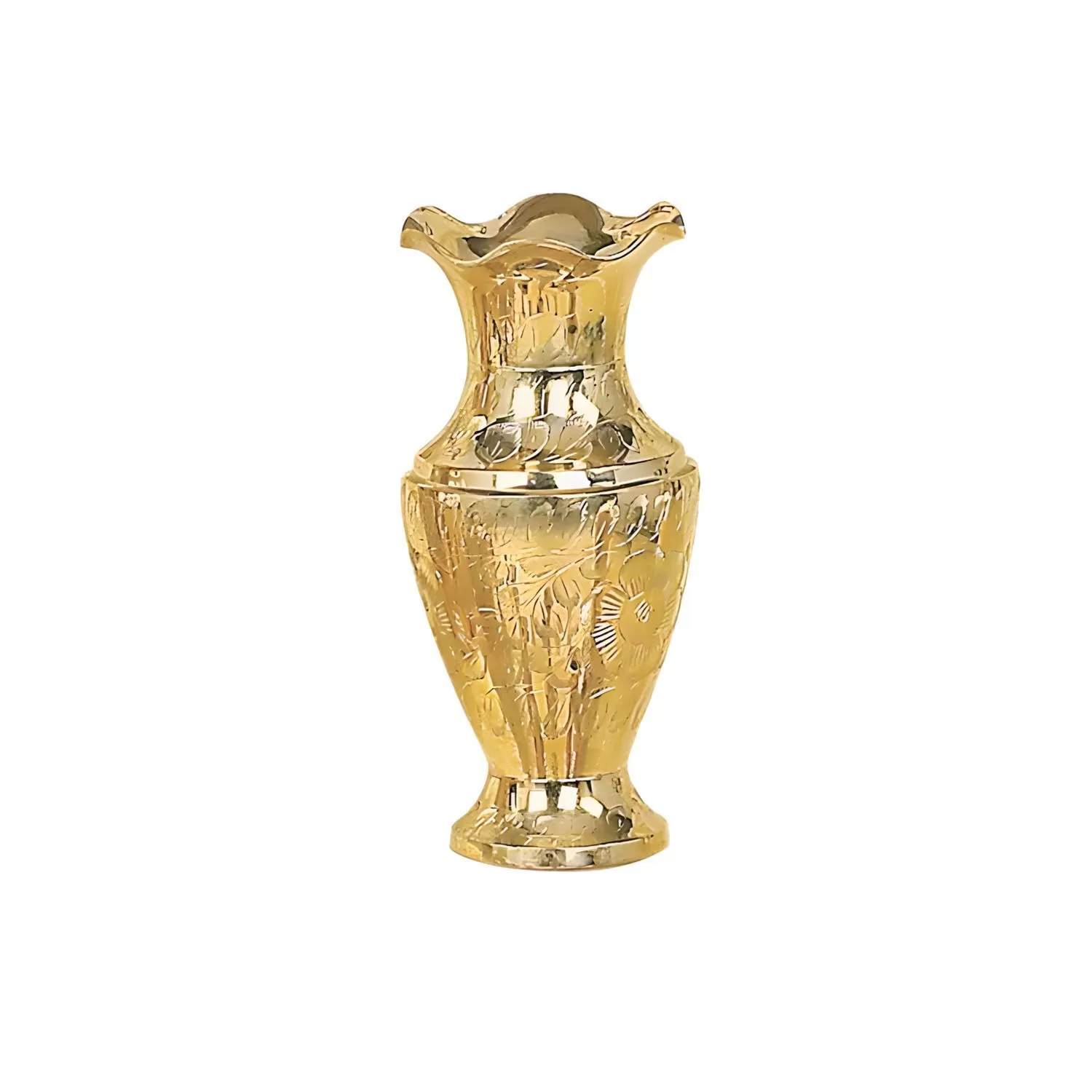 Αυτό το μικρό ανθοδοχείο είναι κατασκευασμένο από μπρούτζο, παρουσιάζοντας ένα λαμπερό χρυσαφί χρώμα. Η επιφάνειά του είναι σκαλισμένη με περίτεχνα ανάγλυφα μοτίβα, τα οποία περιλαμβάνουν σχέδια που καλύπτουν το μεγαλύτερο μέρος του κορμού του. Αυτή η λεπτομέρεια προσδίδει στο αντικείμενο μια ξεχωριστή, διακοσμητική αξία. Το σχήμα του είναι κομψό, με μια σταθερή, στρογγυλή βάση που φαρδαίνει αρμονικά προς το κέντρο και καταλήγει σε έναν κομψό λαιμό. Το άνοιγμα στο πάνω μέρος διαμορφώνεται σε ένα κυματιστό χείλος, ενισχύοντας την αισθητική του.