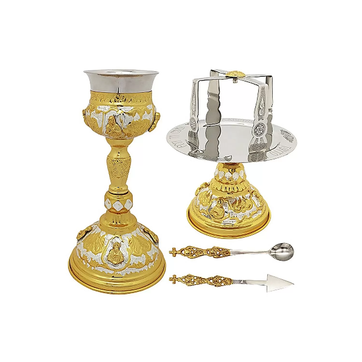 Αυτό το δίχρωμο σετ περιλαμβάνει πέντε βασικά μέρη: το Άγιο Ποτήριον, το Δισκάριο, τον Αστερίσκο, τη Λόγχη και τη Λαβίδα. Το Άγιο Ποτήριον έχει ύψος 33,00 cm και χωρητικότητα 500 ml, με συνολικό βάρος σετ 2,80 kg. Όλα τα τεμάχια είναι κατασκευασμένα από μέταλλο, με κύριο χαρακτηριστικό την επίχρυση επεξεργασία και τις ασημί λεπτομέρειες, δημιουργώντας ένα εντυπωσιακό δίχρωμο αποτέλεσμα. Η διακόσμηση περιλαμβάνει ανάγλυφες παραστάσεις ιερών μορφών και ανάγλυφα φυτικά μοτίβα στη βάση και το σώμα του ποτηρίου, καθώς και στη βάση του δισκαρίου. Τα χερούλια της Λόγχης και της Λαβίδας είναι επίσης περίτεχνα επίχρυσα, ενώ οι λειτουργικές τους άκρες είναι ασημί. Το σχέδιο αντικατοπτρίζει βυζαντινή αισθητική. Χαρακτηριστικά: