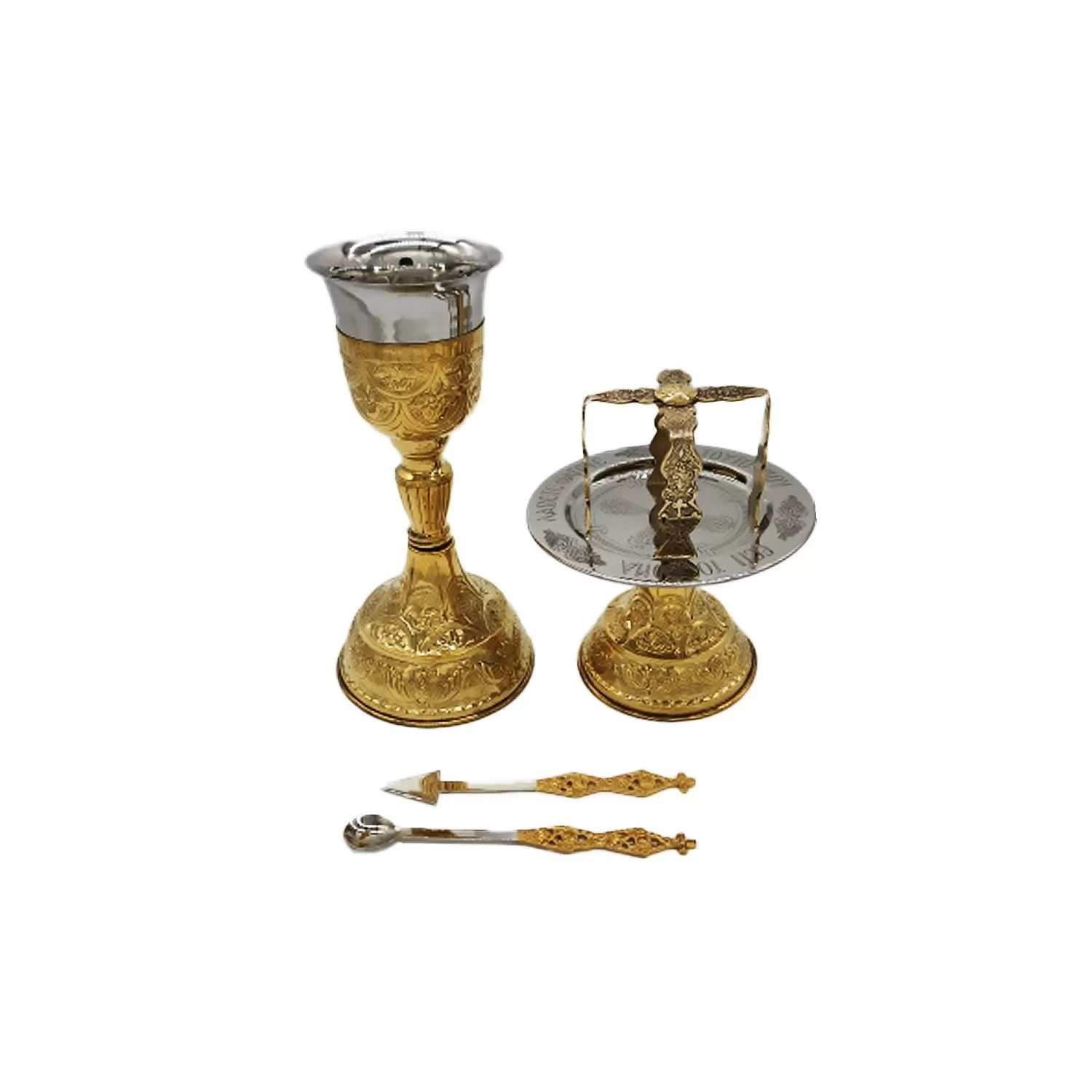 Αυτό το σετ περιλαμβάνει πέντε τεμάχια από μπρούτζο, σχεδιασμένα με λεπτομέρεια. Το κύριο στοιχείο είναι ένα Δισκοπότηρο, το οποίο συνδυάζει χρυσές και ασημί αποχρώσεις. Η βάση και το σώμα του ποτηριού διαθέτουν περίτεχνα χειροποίητα ανάγλυφα σχέδια, που θυμίζουν βυζαντινό ή παραδοσιακό στυλ. Το χείλος του ποτηριού είναι σε ασημί χρώμα. Το σετ συμπληρώνεται από ένα Δισκάριο με βάση, επίσης σε χρυσό και ασημί τόνο, με σκαλιστές λεπτομέρειες. Πάνω στο Δισκάριο τοποθετείται ένας Αστερίσκος, ο οποίος φέρει ένα σταυροειδές σχήμα και χειροποίητα διακοσμητικά στοιχεία. Τα δύο μικρότερα εργαλεία, η Λόγχη και η Λαβίδα, έχουν ασημένιες λεπίδες/κεφαλές και χρυσές, σκαλιστές λαβές, ολοκληρώνοντας το ομοιόμορφο αισθητικό σύνολο.