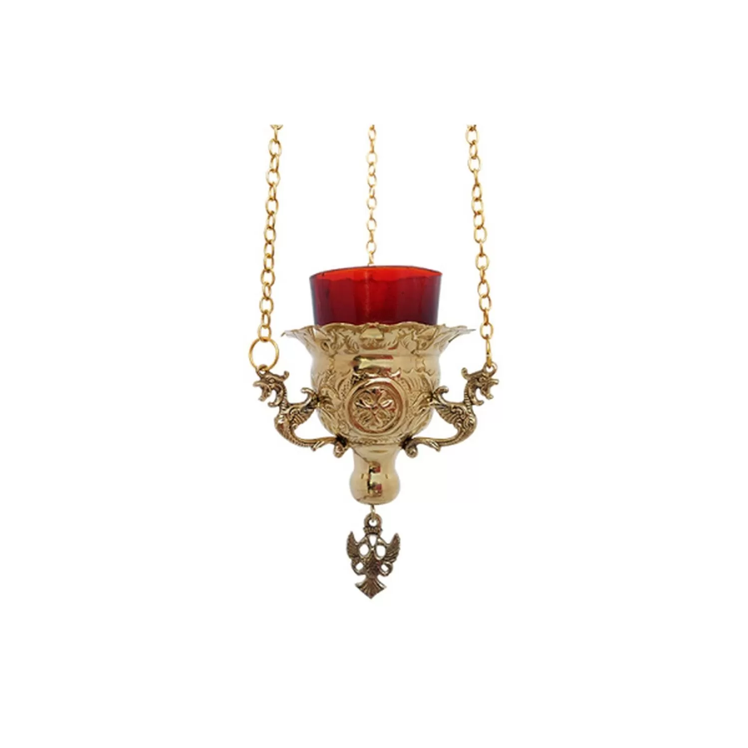 Παραδοσιακό κρεμαστό καντήλι, κατασκευασμένο από μπρούτζο, προσδίδοντας του ένα χρυσαφί χρώμα με πατίνα σε ορισμένα σημεία που τονίζει τις λεπτομέρειες. Η βάση του είναι διακοσμημένη με ένα κεντρικό ανάγλυφο μοτίβο, περιβαλλόμενο από περίτεχνα διακοσμητικά στοιχεία. Στο εσωτερικό του φέρει καντηλόκουπα (κόκκινο ποτήρι). Κρέμεται από τρεις αλυσίδες, ενώ στο κάτω μέρος του υπάρχει ένα κρεμαστό μεταλλικό διακοσμητικό που απεικονίζει έναν δικέφαλο αετό.
