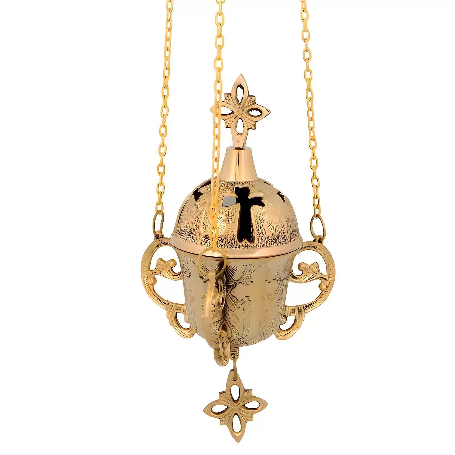 Κρεμαστό παραδοσιακό καντήλι ιδανικό για το εικονοστάσι σας. Είναι κατασκευασμένο από μπρούτζο, σε χρυσό χρώμα. Διαθέτει καπάκι με κοπές σε σχήμα σταυρού, που επιτρέπουν τη διάχυση του φωτός. Ολόκληρη η επιφάνεια του σώματος και του καπακιού κοσμείται με περίτεχνα ανάγλυφα σχέδια, προσδίδοντας μια πλούσια αισθητική. Τρεις λεπτές αλυσίδες συγκρατούν το καντήλι από την κορυφή, καταλήγοντας σε ένα διακοσμητικό στοιχείο. Στο κάτω μέρος κρέμεται ένα διακοσμητικό στοιχείο σε σχήμα σταυρού, ενώ δύο καμπυλωτές λαβές κοσμούν το σώμα του.