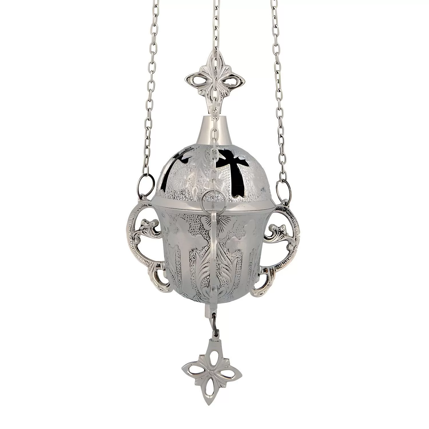 Κρεμαστό παραδοσιακό καντήλι ιδανικό για το εικονοστάσι σας. Είναι κατασκευασμένο από επινικελωμένο μέταλλο, παρουσιάζοντας ένα φωτεινό ασημί χρώμα. Διαθέτει πλούσια διακόσμηση με ανάγλυφα σχέδια που καλύπτουν τόσο το κυρίως σώμα όσο και το καπάκι του. Το καπάκι περιλαμβάνει τέσσερα ανοίγματα σε σχήμα σταυρού, τα οποία ενισχύουν την αισθητική του. Το καντήλι στηρίζεται από τρεις λεπτές αλυσίδες που καταλήγουν σε ένα κεντρικό διακοσμητικό στοιχείο στην κορυφή. Στο κάτω μέρος του κεντρικού σώματος υπάρχει ένα επιπλέον διακοσμητικό κρεμαστό στοιχείο, ολοκληρώνοντας τη συνολική του εμφάνιση. Το σώμα διαθέτει επίσης δύο διακοσμητικές λαβές στο πλάι.