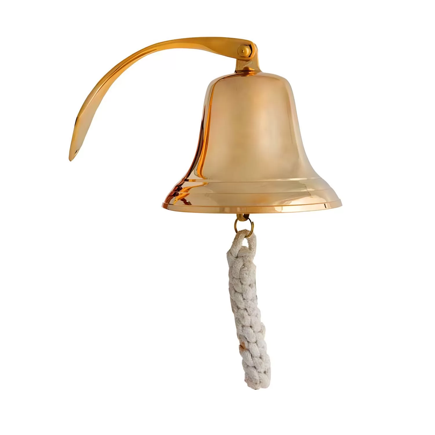 Μία μπρούτζινη καμπάνα με χρυσαφί φινίρισμα, σχεδιασμένη για στήριξη σε τοίχο. Η καμπάνα διαθέτει κλασική, κωνική μορφή με φαρδιά βάση και γυαλιστερή επιφάνεια που αντανακλά το φως. Στο επάνω μέρος της ενσωματώνεται ένας κυρτός μπρούτζινος βραχίονας, ο οποίος λειτουργεί ως βάση για την τοποθέτησή της. Από το κάτω μέρος της καμπάνας κρέμεται ένα πλεκτό σχοινί σε λευκή απόχρωση, το οποίο χρησιμεύει για την κρούση της. Το αντικείμενο προσφέρει μια διαχρονική αισθητική.