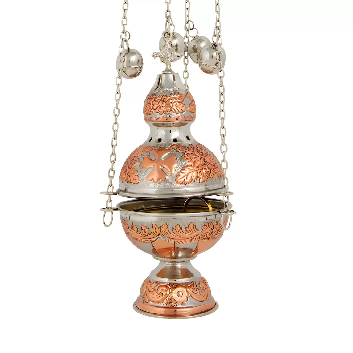 Αυτό το δίχρωμο θυμιατό προσφέρει μια διακριτική ομορφιά και πρακτικότητα για κάθε ιερό χώρο. Είναι σκαλιστό με προσοχή στη λεπτομέρεια, συνδυάζοντας το χάλκινο με το νίκελ φινίρισμα, δημιουργώντας ένα παραδοσιακό σχέδιο. Με ύψος 23 cm και βάρος 0.750 kg, έχει σταθερή και άνετη αίσθηση στο χέρι, κάνοντας το θυμίαμα εύκολο και ευχάριστο. Είναι ιδανικό για χρήση στην εκκλησία ή ένα παρεκκλήσι, αλλά και για το οικογενειακό εικονοστάσι. Αποτελεί επίσης ένα όμορφο και διαχρονικό δώρο που τιμά την παράδοση.