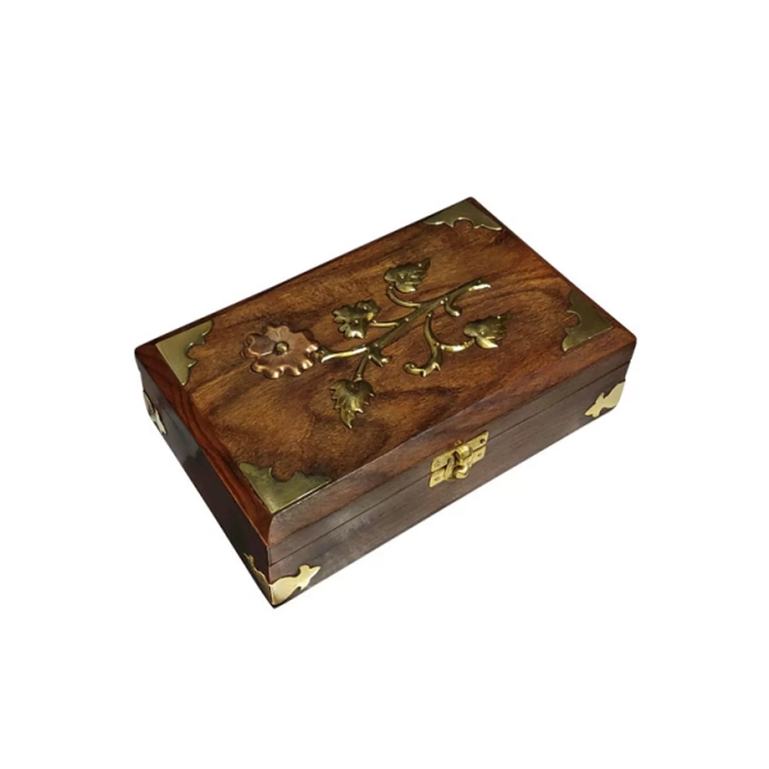 Αυτό το ορθογώνιο κουτί αποθήκευσης είναι κατασκευασμένο από σκούρο καφέ ξύλο, προσδίδοντας ένα ζεστό και παραδοσιακό ύφος. Το καπάκι και οι πλευρές του κοσμούνται με μπρούτζινα διακοσμητικά στοιχεία. Οι τέσσερις γωνίες του καπακιού, καθώς και οι αντίστοιχες στη βάση του κουτιού, προστατεύονται και διακοσμούνται με μπρούτζινα σκαλιστά στοιχεία. Ένα μπρούτζινο κούμπωμα βρίσκεται στο μπροστινό μέρος, εξασφαλίζοντας το ασφαλές κλείσιμο του κουτιού.