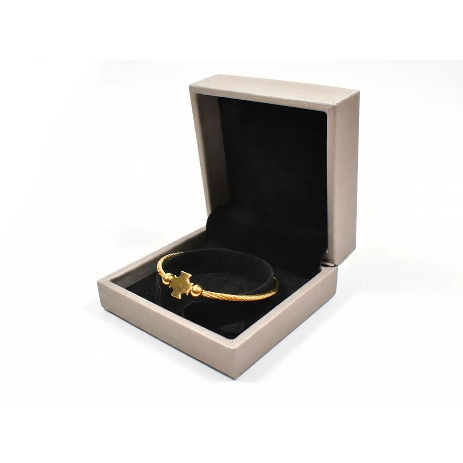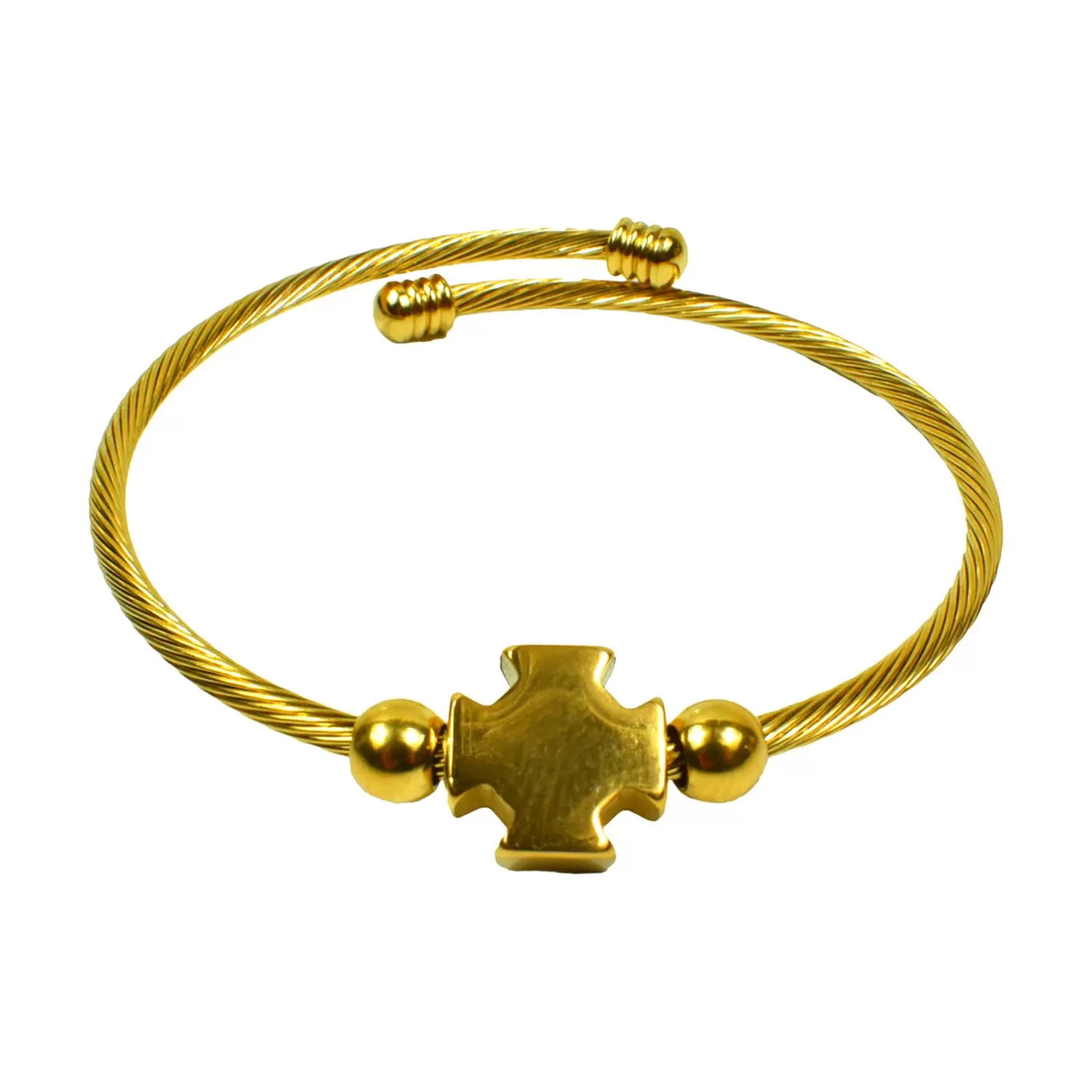 Παραδοσιακό κομψό και διακριτικό θρησκευτικό κόσμημα, σχεδιασμένο με έμπνευση από τη βυζαντινή παράδοση. Το βραχιόλι διαθέτει σταθερό σκελετό τύπου «βέργας» που καταλήγει σε έναν κεντρικό βυζαντινό σταυρό πλαισιωμένο από διακοσμητικά σφαιρίδια.