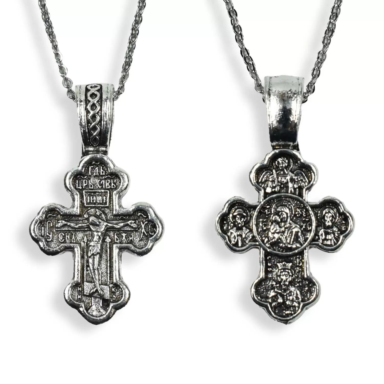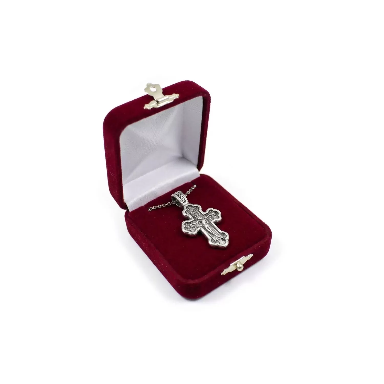 Ένα κόσμημα βαθιάς πνευματικής σημασίας, αυτός ο σταυρός φέρει ανάγλυφη την παράσταση του Εσταυρωμένου Χριστού, υπενθυμίζοντας τη θυσία και την αγάπη Του για τον άνθρωπο. Κάθε λεπτομέρεια είναι φιλοτεχνημένη με σεβασμό στην ορθόδοξη παράδοση, είναι ένα σύμβολο πίστης και προστασίας. Συνοδεύεται από διακριτική αλυσίδα, έτοιμος να φορεθεί και να αποτελέσει προσωπικό φυλαχτό.