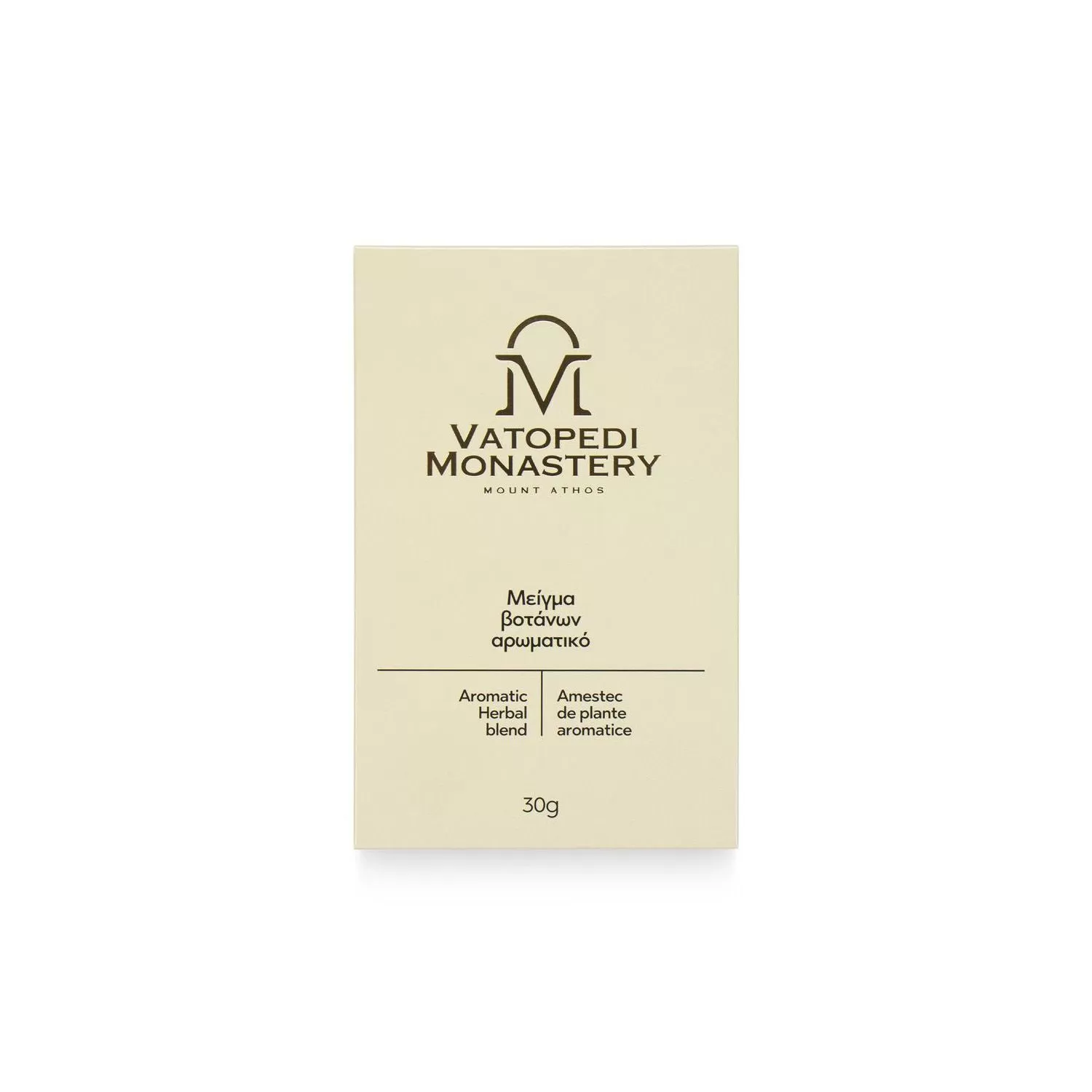 Αυτό το παραδοσιακό μοναστηριακό μείγμα αρωματικών βοτάνων προέρχεται από την Ιερά Μεγίστη Μονή Βατοπαιδίου και αποτελεί προϊόν της ιερής παράδοσης του Αγίου Όρους. Τα βότανα μαζεύονται με το χέρι από τους πατέρες της μονής και επεξεργάζονται με φροντίδα, ώστε να διατηρούνται η φρεσκάδα και οι φυσικές τους αρωματικές ιδιότητες. Το μείγμα περιλαμβάνει τριαντάφυλλο, λουΐζα, σιδηρίτη, λεβάντα, μέντα και γεράνι, προσφέροντας μια ήπια, αρωματική εμπειρία που υποστηρίζει τη χαλάρωση και την ευεξία του σώματος και του πνεύματος.