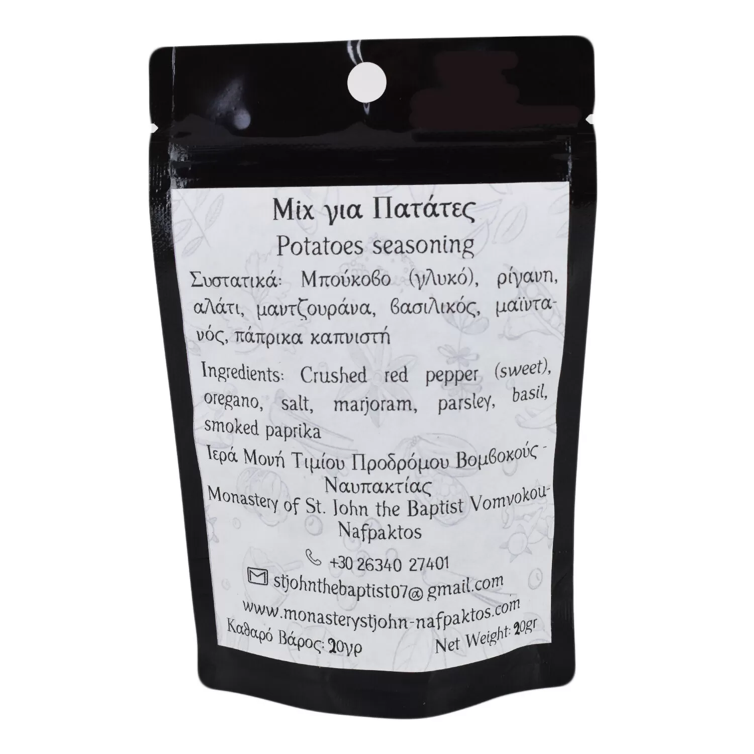 Οι μοναχές της Ιεράς Μονής Τιμίου Προδρόμου Βομβοκούς με μεράκι διαλέγουν και αναμειγνύουν τα εκλεκτότερα συστατικά, για να φτιάξουν αυτό το αγνό και δυνατό μείγμα μπαχαρικών για πατάτες. Αυτό το καρύκευμα παρασκευάζεται κατά την μακρά μοναστηριακή παράδοση και την αφοσίωση των μοναχών στην παράδοση.