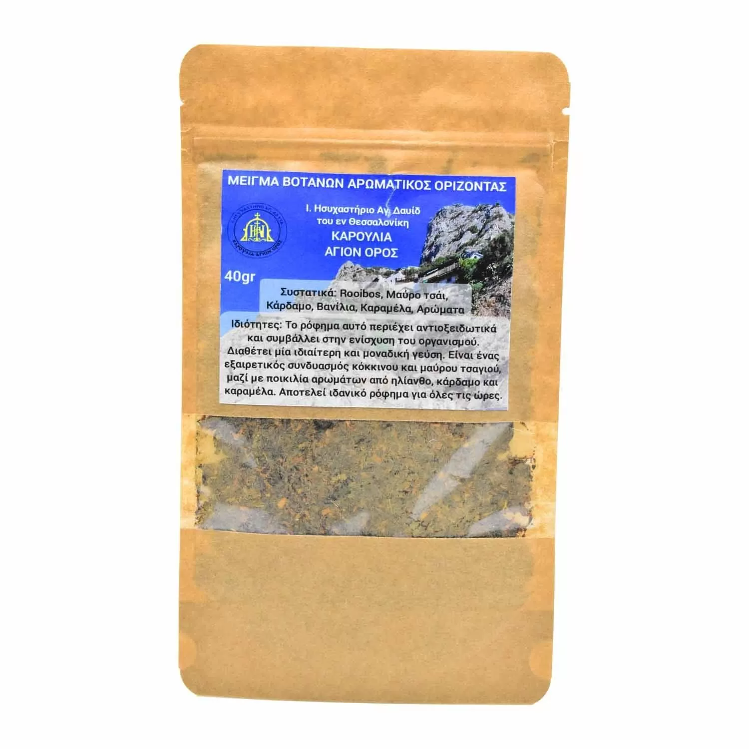 Αυτό το αρωματικό μείγμα βοτάνων "Αρωματικός Ορίζοντας" προέρχεται από το Ιερό Ησυχαστήριο Αγίου Δαυίδ του εν Θεσσαλονίκη, με την παράδοση του Αγίου Όρους. Το ρόφημα αυτό περιέχει πλούσια αντιοξειδωτικά και συμβάλλει στην ενίσχυση του οργανισμού, προσφέροντας μια ιδιαίτερη και μοναδική γεύση. Αποτελεί έναν εξαιρετικό συνδυασμό rooibos και μαύρου τσαγιού, εμπλουτισμένο με αρώματα κάρδαμου, βανίλιας και καραμέλας, ιδανικό για απόλαυση όλες τις ώρες.