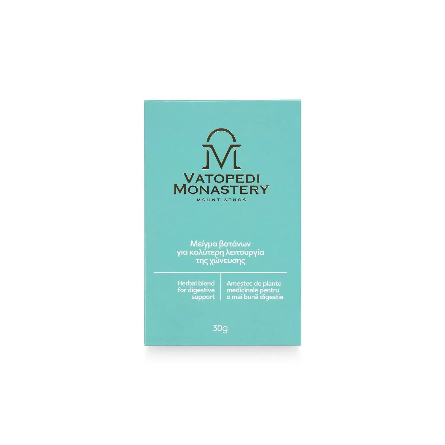 Παραδοσιακό μοναστηριακό μείγμα βοτάνων από το Άγιον Όρος, προερχόμενο από την Ιερά Μεγίστη Μονή Βατοπαιδίου, έχει σχεδιαστεί για να υποστηρίζει τη σωστή λειτουργία της πέψης. Όλα τα βότανα συλλέγονται με το χέρι από τους πατέρες και επεξεργάζονται σε μικρές παρτίδες για να διασφαλιστεί η φρεσκάδα και να διατηρηθούν οι φυσικές τους ιδιότητες. Το μείγμα περιλαμβάνει προσεκτικά επιλεγμένα βότανα που χρησιμοποιούνται εδώ και χρόνια για την ανακούφιση πεπτικών προβλημάτων, προάγοντας τη φυσική ευεξία και βελτιώνοντας την υγεία του πεπτικού συστήματος. Περιέχει μέντα, δυόσμο, μάραθο, αχίλλεια, ρίγανη και θυμάρι, γνωστά για τις ευεργετικές τους ιδιότητες στη χώνευση.