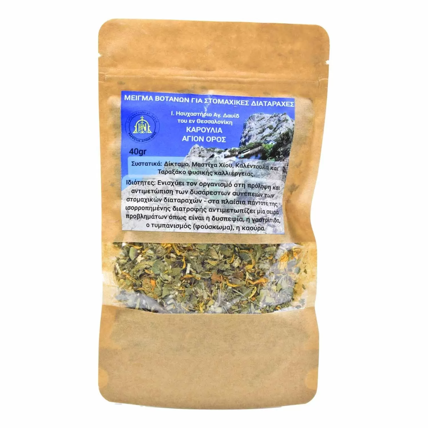 Αυτό το φυσικό μείγμα βοτάνων προέρχεται από το Ι. Ησυχαστήριο Αγ. Δαυίδ στην Καρουλιά του Αγίου Όρους. Περιλαμβάνει δίκταμο, μαστίχα Χίου, καλέντουλα και ταραξάκο από φυσική καλλιέργεια, όλα γνωστά για τις ευεργετικές τους ιδιότητες. Το μείγμα είναι σχεδιασμένο για να ενισχύει τον οργανισμό στην πρόληψη και αντιμετώπιση των δυσάρεστων συνεπειών των στομαχικών διαταραχών, όπως η δυσπεψία, η γαστρίτιδα, το φούσκωμα και η καούρα, στο πλαίσιο μιας ισορροπημένης διατροφής. Αποτελεί ένα αγνό μοναστηριακό προϊόν, 40gr, με σεβασμό στην παράδοση και τη φύση.