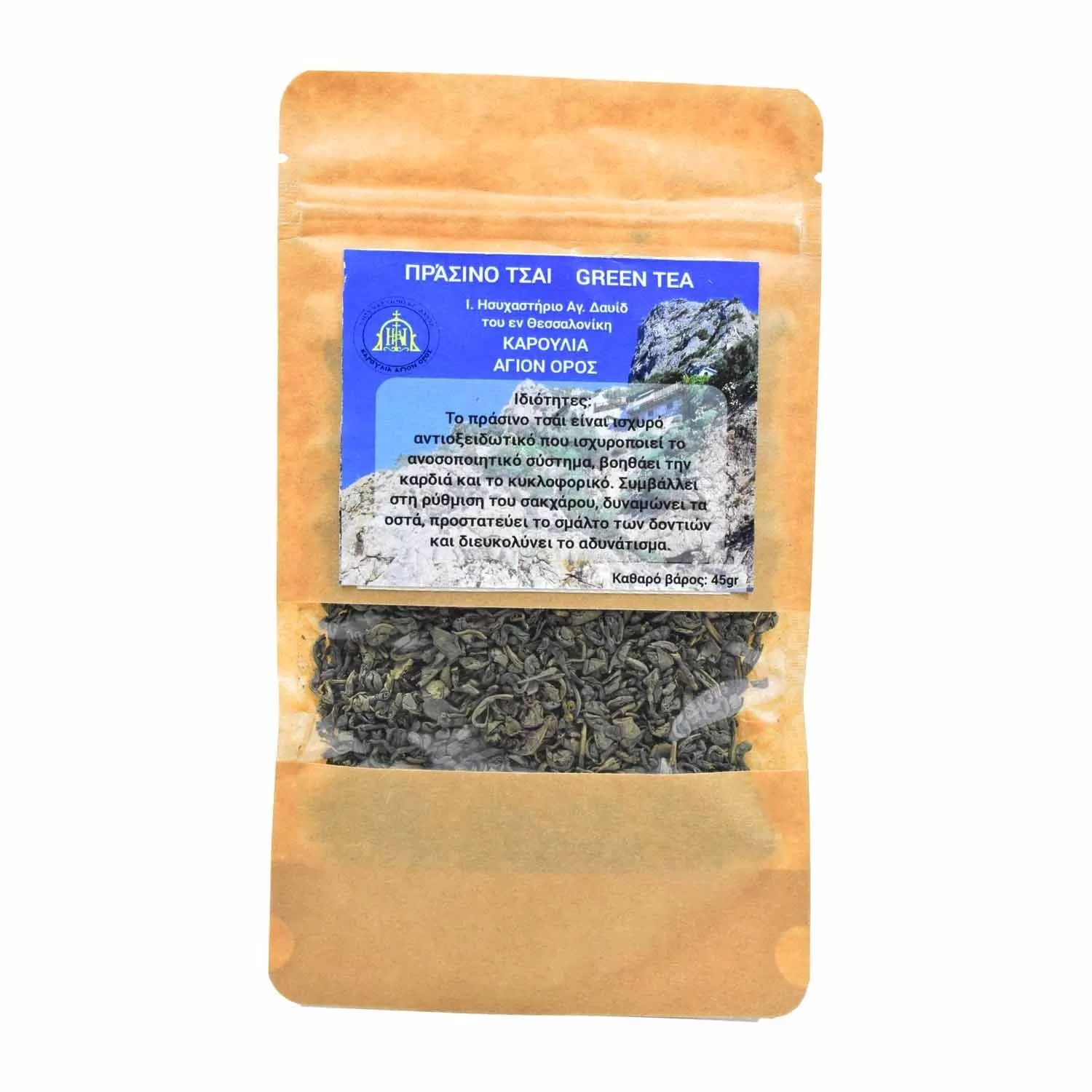 Απολαύστε το αυθεντικό αγιορείτικο πράσινο τσάι από το Ι. Ησυχαστήριο Αγ. Δαυίδ στα Καρούλια του Αγίου Όρους. Αυτό το φυσικό προϊόν είναι ένα ισχυρό αντιοξειδωτικό που ενισχύει το ανοσοποιητικό σύστημα και συμβάλλει στην υγεία της καρδιάς και του κυκλοφορικού. Βοηθάει στη ρύθμιση του σακχάρου, δυναμώνει τα οστά και προστατεύει το σμάλτο των δοντιών. Ιδανικό για όσους αναζητούν έναν υγιεινό τρόπο ζωής και διευκολύνει το αδυνάτισμα, προσφέροντας παράλληλα μια γεύση από την πνευματική κληρονομιά του Άθω. Καθαρό βάρος: 45gr.