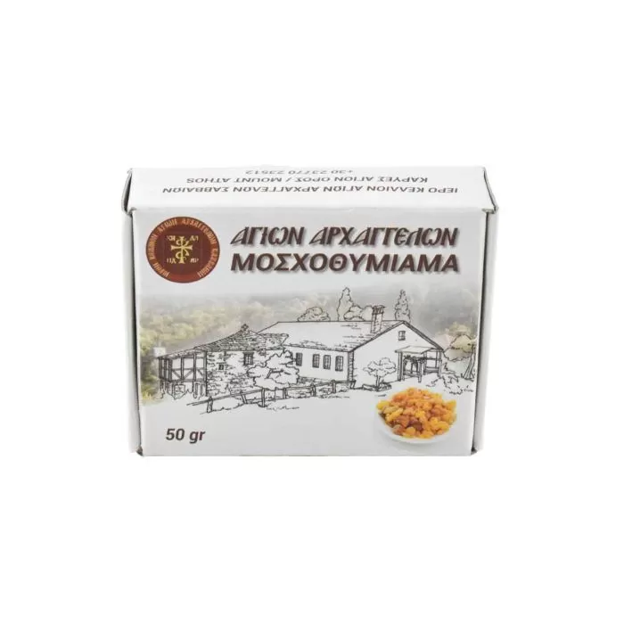 Αυτό το μοσχοθυμίαμα προέρχεται από το Ιερό Κελί των Αρχαγγέλων στο Άγιον Όρος, κατασκευασμένο με δεξιοτεχνία από τους πατέρες εδώ στο Άγιον Όρος. Συνδυάζοντας φυσικά συστατικά με ποιοτικά αρώματα, κάθε κομμάτι είναι φτιαγμένο με προσοχή ακολουθώντας τις παλιές παραδόσεις, ζυμώνεται, στεγνώνει, πλάθεται και κόβεται σε μικρά κομμάτια και στη συνέχεια επικαλύπτεται με σκόνη μαγνησίας. Αυτό εξασφαλίζει καθαρή καύση και ένα διαρκές και ευχάριστο άρωμα.