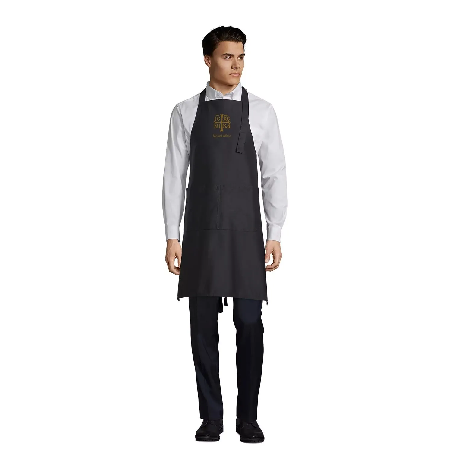 Στο στήθος δεσπόζει χρυσό κέντημα χειρός υψηλής αισθητικής, το οποίο απεικονίζει τον Σταυρό με το χριστιανικό σύμβολο "ΙΣ ΧΣ ΝΙ ΚΑ" και την επιγραφή "Mount Athos". Είναι σχεδιασμένη σε γραμμή One Size με ρυθμιζόμενο λουράκι στο λαιμό, ώστε να προσαρμόζεται εύκολα σε κάθε σωματότυπο. Διαθέτει ευρύχωρη διπλή τσέπη στο μπροστινό μέρος για πρακτικότητα κατά την εργασία.